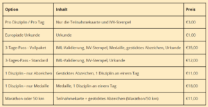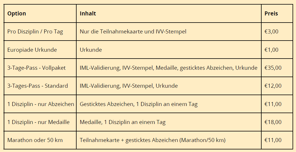 Ihre Anmeldung DE Ihre Anmeldung zur IVV Europiade Ihr Name Ihr Vorname Adresse Postleitzahl Ortschaft Ihre E-Mail Ihr Wohnsitzland - Bitte wählen Sie eine Option —Veuillez choisir une option—376-Andorra61-Australien32-Belgien55-Brasilien86-China45-Dänemark49-Deutschland372-Estland358-Finnland33-Frankreich44-Grossbritannien62-Indonesien39-Italien81-Japan11-Kanada238-Kap Verde82-Korea370-Litauen352-Luxemburg64-Neuseeland31-Niederlande47-Norwegen43-Österreich48-Polen351-Portugal7-Russland46-Schweden41-Schweiz421-Slowakei386-Slowenien34-Spanien886-Taiwan420-Tschechien36-Urgarn1-Vereinigte Staaten357-Zypern Ihr Wohnsitzland, falls es nicht in der obigen Liste aufgeführt ist. Ihre Anmeldung - Bitte wählen Sie eine Option (Mehrere mögliche Auswahlmöglichkeiten) 1. €3.00 - Pro Disziplin / Pro Tag - Nur die Teilnahmekaarte und IVV-Stempel - €3,002. €1.00 - Europiade Urkunde Urkunde - €1,003. €35.00 - Drei-Tage-Pass - Vollpaket IML-Validierung, IVV-Stempel, Medaille, gesticktes Abzeichen, Urkunde - €35,004. €12.00 - Drei-Tages-Pass - Standard IML-Validierung, IVV-Stempel, Urkunde - €12,005. €11.00 - Eine Disziplin - nur Abzeichen Gesticktes Abzeichen, Eine Disziplin an einem Tag - €11,006. €18.00 - Eine Disziplin - nur Medaille Medaille, Eine Disziplin an einem Tag - €18,007. €11.00 - Marathon oder 50 km - Teilnahmekarte + gesticktes Abzeichen (Marathon/50 km) - €11,00 Ich überweise den Betrag auf das Konto Nr. BE38 9734 8159 9172 zugunsten von IVV EUROPIADE 2026. Anmerkung Ihre Nachricht (optional)