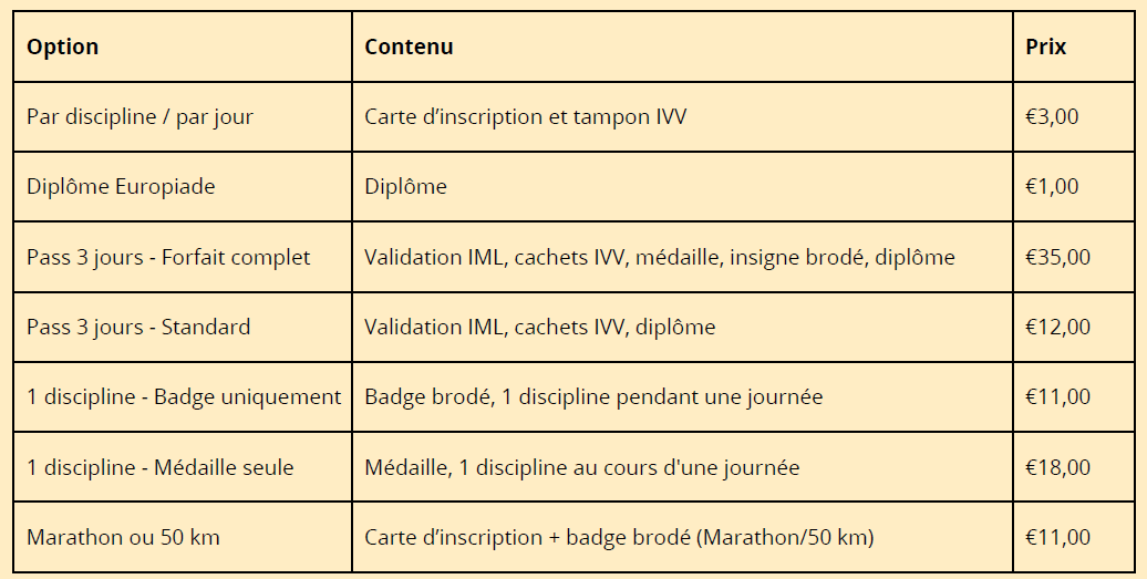 Inscriptions FR Votre inscription à l’IVV Europiade Votre nom Votre prénom Adresse Code postal Localité Votre courriel Votre pays de résidence —Veuillez choisir une option—49-Allemagne376-Andorre61-Australie43-Autriche32-Belgique55-Brésil11-Canada238-Cap Vert86-Chine357- Chypre82-Corée45-Danemark34-Espagne372-Estonie1-Etats-Unis358-Finlande33-France44-Grande-Bretagne36-Hongrie62-Indonésie39-Italie81-Japon370-Lituanie352-Luxembourg47-Norvège64-Nouvelle-Zélande31-Pays-Bas48-Pologne351-Portugal420-République Tchèque7-Russie421-Slovaquie386- Slovénie46-Suède41-Suisse886-Taïwan Votre pays de résidence si pas repris dans la liste ci-dessus Votre inscription (Plusieurs choix possible) 1. €3.00 - Par discipline / par jour - Carte d’inscription et tampon IVV - €3,002. €1.00 - Diplôme Europiade Diplôme - €1,003. €35.00 - Pass 3 jours - Forfait complet Validation IML, cachets IVV, médaille, insigne brodé, diplôme - €35,004. €12.00 - Pass 3 jours - Standard Validation IML, cachets IVV, diplôme - €12,005. €11.00 - Une discipline - Badge uniquement Badge brodé, une discipline pendant une journée - €11,006. €8.00 - Une discipline - Médaille seule Médaille, une discipline au cours d'une journée - €18,007. €11.00 - Marathon ou 50 km - Carte d’inscription + badge brodé (Marathon/50 km) - €11,00 Je verse la somme sur le n° de compte BE38 9734 8159 9172 au nom de IVV EUROPIADE 2026. Remarques Observations (option)