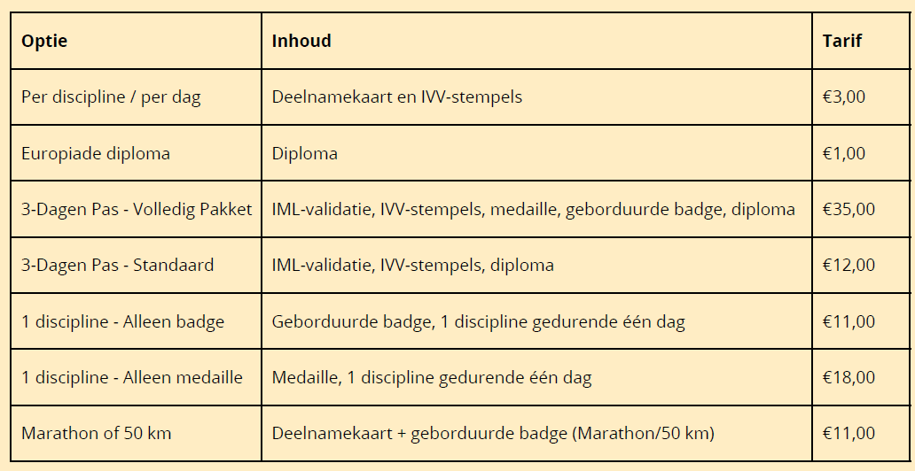 Uw inschrijving NL Uw registratie voor de IVV Europiade Uw naam Uw voornaam Adres Postcode Plaats Uw e-mail Uw woonland —Veuillez choisir une option—376-Andorra61-Australië32-België55-Braziliën11-Canada86-China357-Cyprus45-Dennemark49-Duitsland372-Estland358-Finland33-Frankrijk44-Groot-Britannië36-Hongarije62-Indonesië39-Italië81-Japan238-Kaapverdïe82-Korea370-Lithuania352-Luxemburg31-Nederland64-Nieuw-Zeeland47-Noorwegen43-Oostenrijk48-Polen351-Portugal7-Rusland386-Slovenië421-Slowakije34-Spanje46-Sweden41-Switzerland886-Taiwan420-Tsjechische Republiek1-Verenigde Staten Uw woonland als het niet in de bovenstaande lijst staat Uw inschrijving (Verschillende mogelijke keuzes) —Veuillez choisir une option—1. €3.00 - Per discipline / per dag - Deelnamekaart en IVV-stempels - €3,002. €1.00 - Europiade diploma Diploma - €1,003. €35.00 - Drie-Dagen Pas - Volledig Pakket IML-validatie, IVV-stempels, medaille, geborduurde badge, diploma - €35,004. e12.00 - Drie-Dagen Pas - Standaard IML-validatie, IVV-stempels, diploma - €12,005. €11.00 - Één discipline - Alleen badge Geborduurde badge, Één discipline gedurende één dag - €11,006. €18.00 - Één discipline - Alleen medaille Medaille, Één discipline gedurende één dag - €18,007. €11.00 - Marathon of 50 km - Deelnamekaart + geborduurde badge (Marathon/50 km) - €11,00 Ik stort het bedrag op het rekeningnummer BE38 9734 8159 9172 op naam van IVV EUROPIADE 2026 Opmerkingen Uw bericht (optioneel)